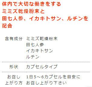 原材料:田七人参(国内製造)、ミミズ乾燥粉末、でん粉、乳糖、ナタネ硬化油/HPMC、キトサン(イカ由来)、結晶セルロース、ルチン